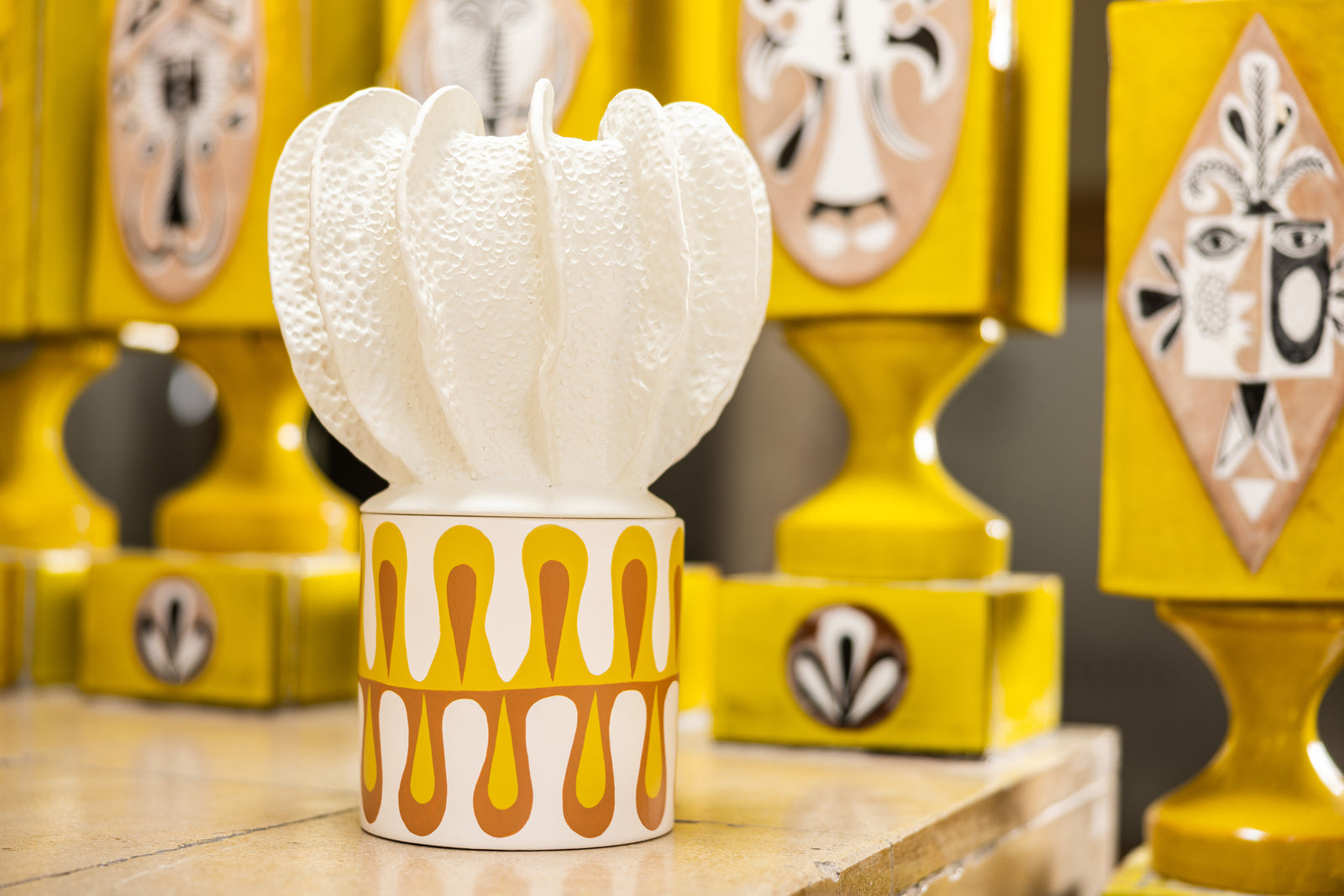 This decorative object with sculptural shapes was created alongside the ceramist Jean Roger and hand painted by the Roma workshop. It is inspired by nature and the marine world. An object imagined as a work of art, a sculpture to be exhibited as a collection.