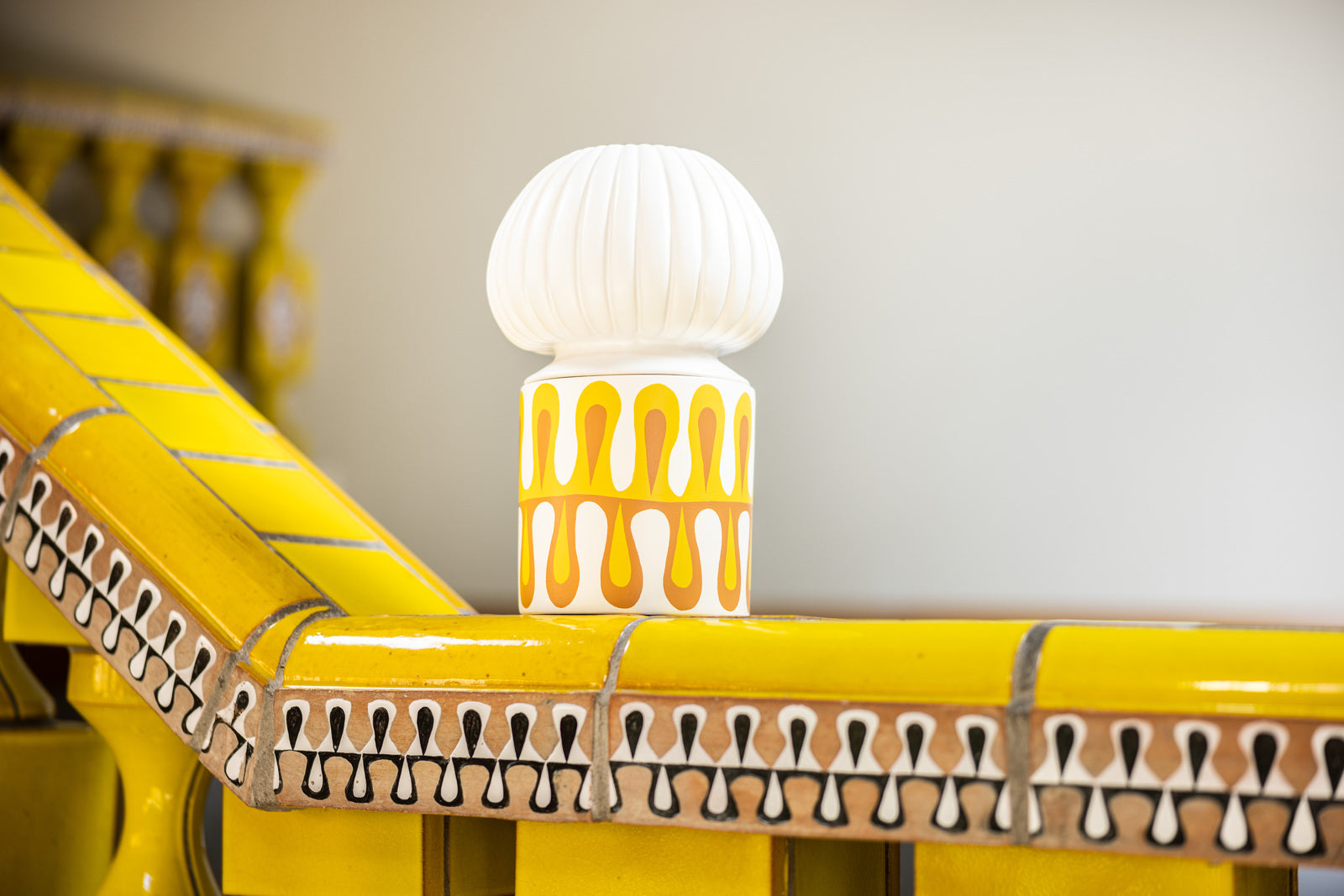 For this unique creation, interior designer Laura Gonzalez uses the colors and patterns of the majestic yellow staircase, signed by Roger Capron, an illustrious ceramist from Vallauris.