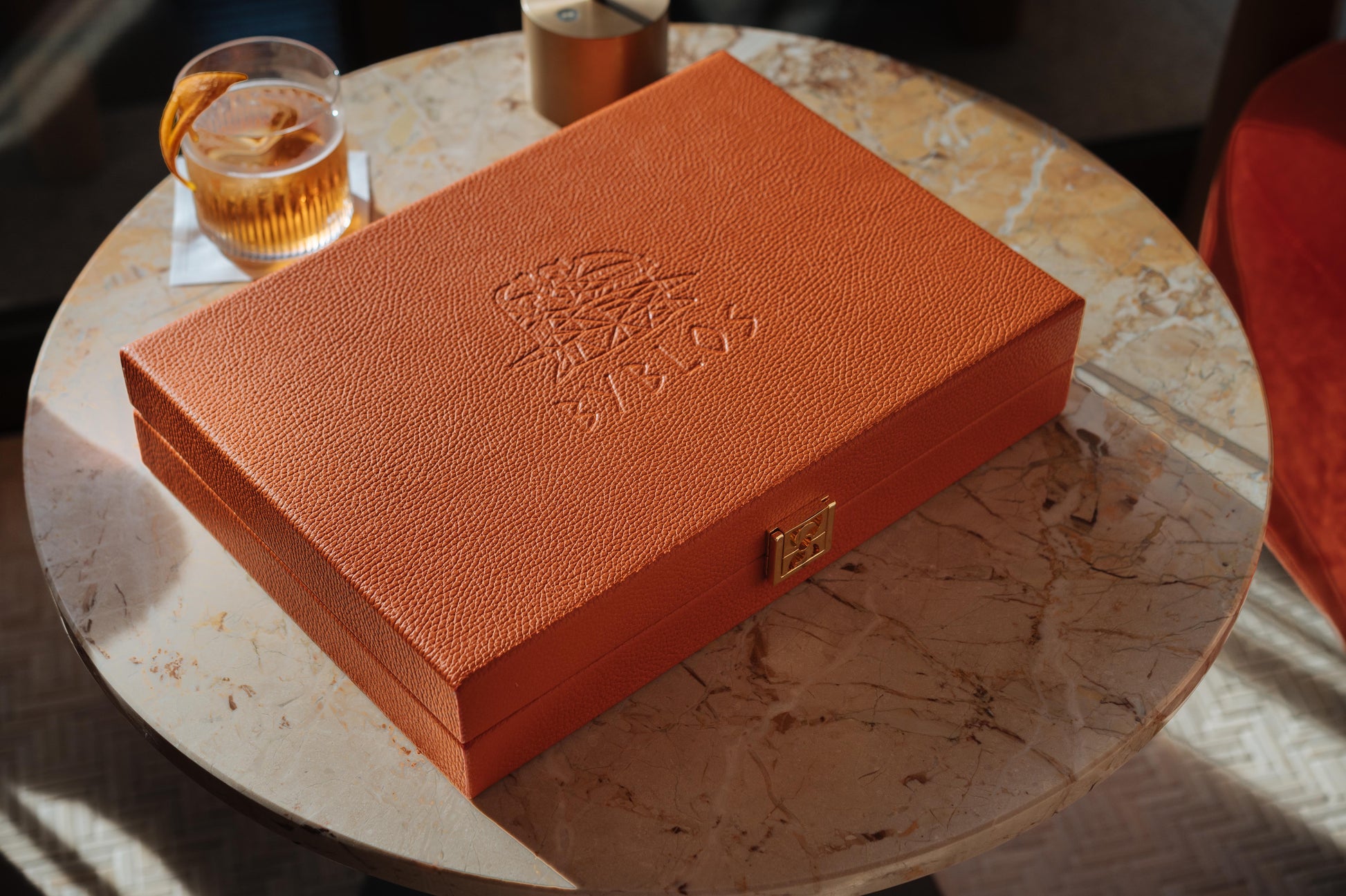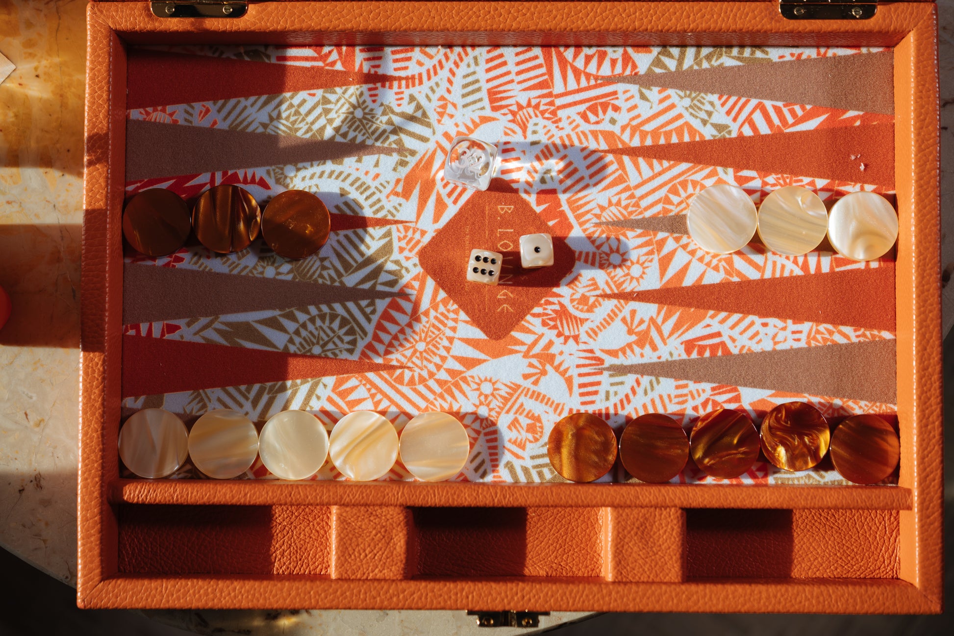 Réalisé en cuir de buffle dans une teinte orange éclatante, ce backgammon est sublimé par l’iconique symbole du Byblos, embossé avec finesse.