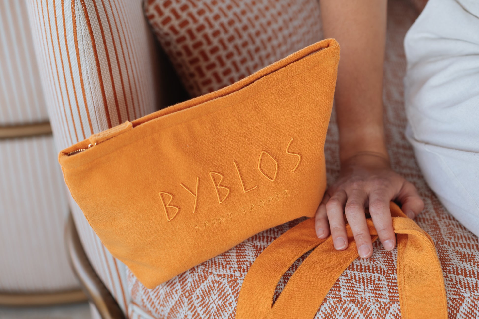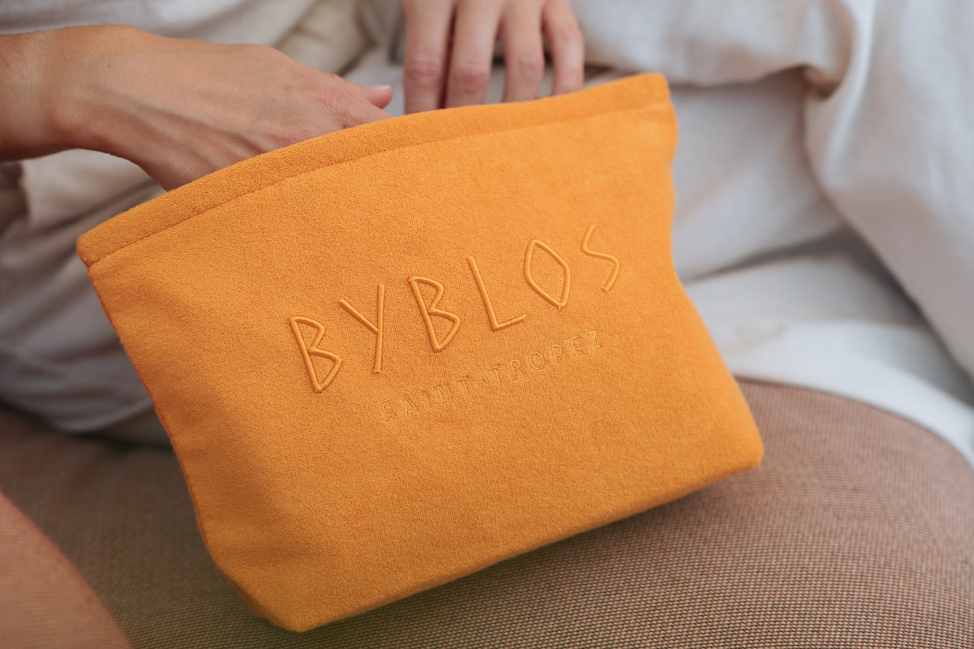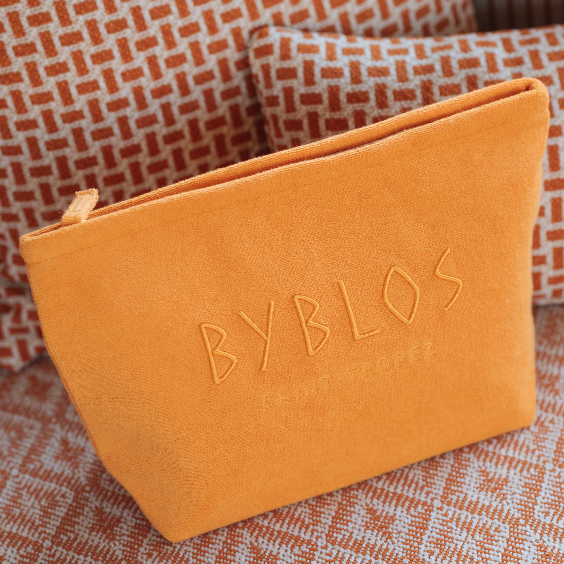 Confectionnée dans une éponge douce, cette trousse est parfaite pour y glisser vos essentiels avec style, que ce soit à la plage du Byblos, au spa ou en voyage.